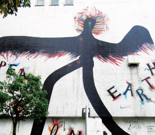 “The war was futile for Japan,” he says. Images of peace are constant in his work and the occasional presence of violence: in his Amerika-mura mural, the nightmarish bird-man creature walks through the words ‘Peace on Earth’; doves predominated in the Tohoku images. I later asked him about the recurrent images of peace, and he replied cryptically, “they are very important to me, but I don’t like to talk about them.”