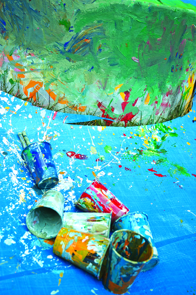 To work. He is here to paint: wood panels and the concrete benches, with the help of all the kids of course. He punctuates his activities with little talks for the benefit of his audience: “To be born is a miracle; just be happy!” Fine sentiments but whether they sunk in with the primary school kids is not clear. But they were happy, clad in plastic covers to keep the flying paint off their clothes, they daubed and splashed the concrete and the wood and eventually got their hands in too, creating an effect to put the ‘riot’ in ‘colour’.